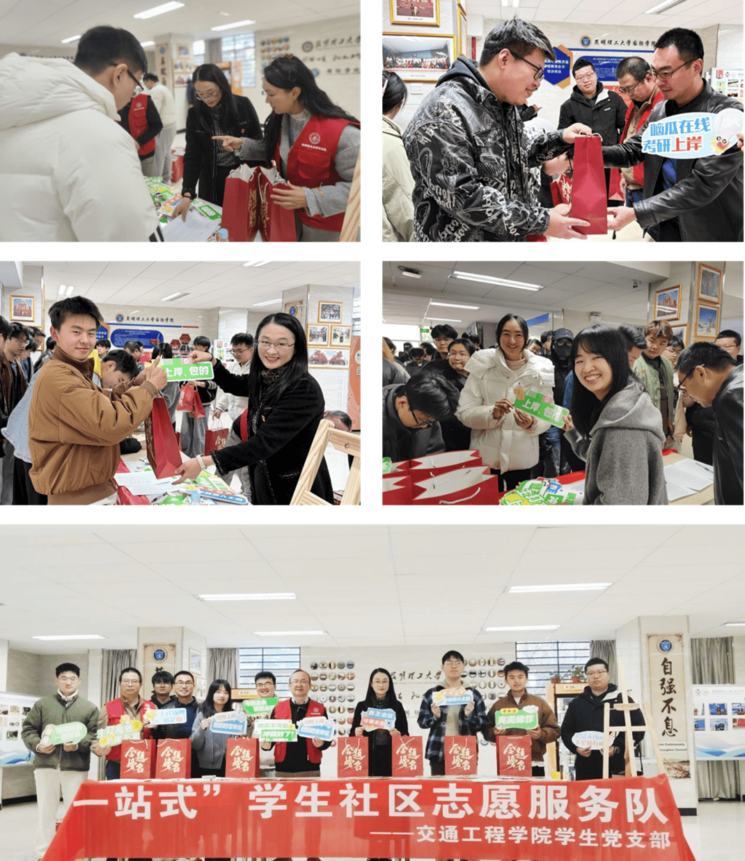 12月11日下午,昆明理工大学交通工程学院在恒园3栋宿舍大厅举办考研送温暖活动。学院党委副书记赵佳及辅导员、班主任代表共同为2026届考研学子送上定制版“考研加油福袋”,以暖心行动助力学子冲刺备考。