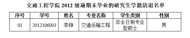 根据教育部第41号令《普通高等学校学生管理规定》及《昆明理工大学研究生学籍管理实施细则(2020年修订)》(昆理工大校校发[2021]1号)文的规定,现交通工程学院对2012级逾期未毕业的1名研究生进行学籍清退。