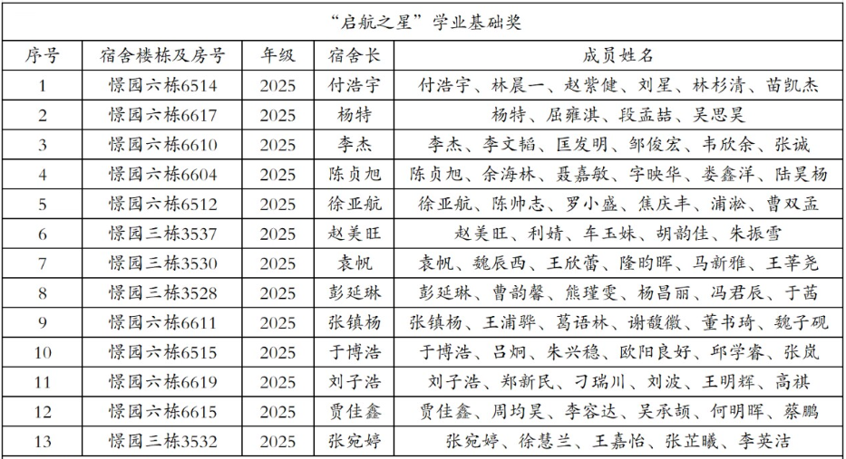 本次评选以宿舍为单位组织申报,旨在表彰在学业上共同进步、互助成长的先进集体。经学院学生工作领导小组严格审核、认定与公示,最终评选出13个学业示范宿舍和4个考研示范宿舍,分别荣获“启航之星”学业基础奖和“攀登之星”考研风尚奖。